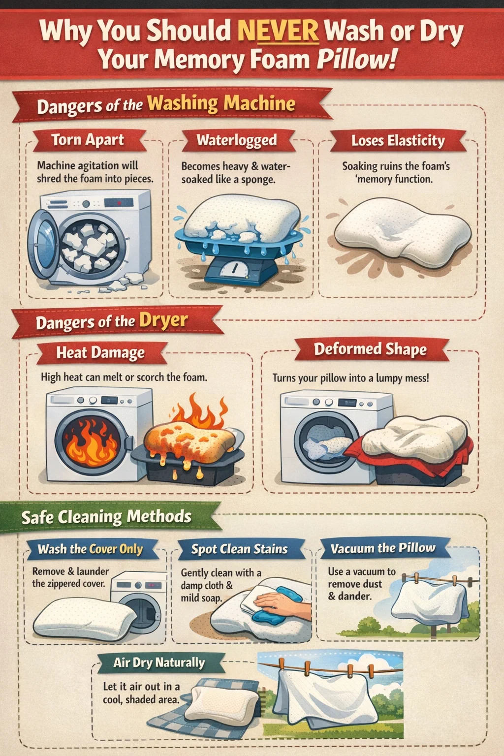 メモリーフォームは温度に非常に敏感です。乾燥機の高温はメモリーフォーム素材を直接「焼き付け」、劣化の原因となります。せいぜい、もろくなり、もろくなるだけです。最悪の場合、溶けたり、火災の危険さえある可能性があります。