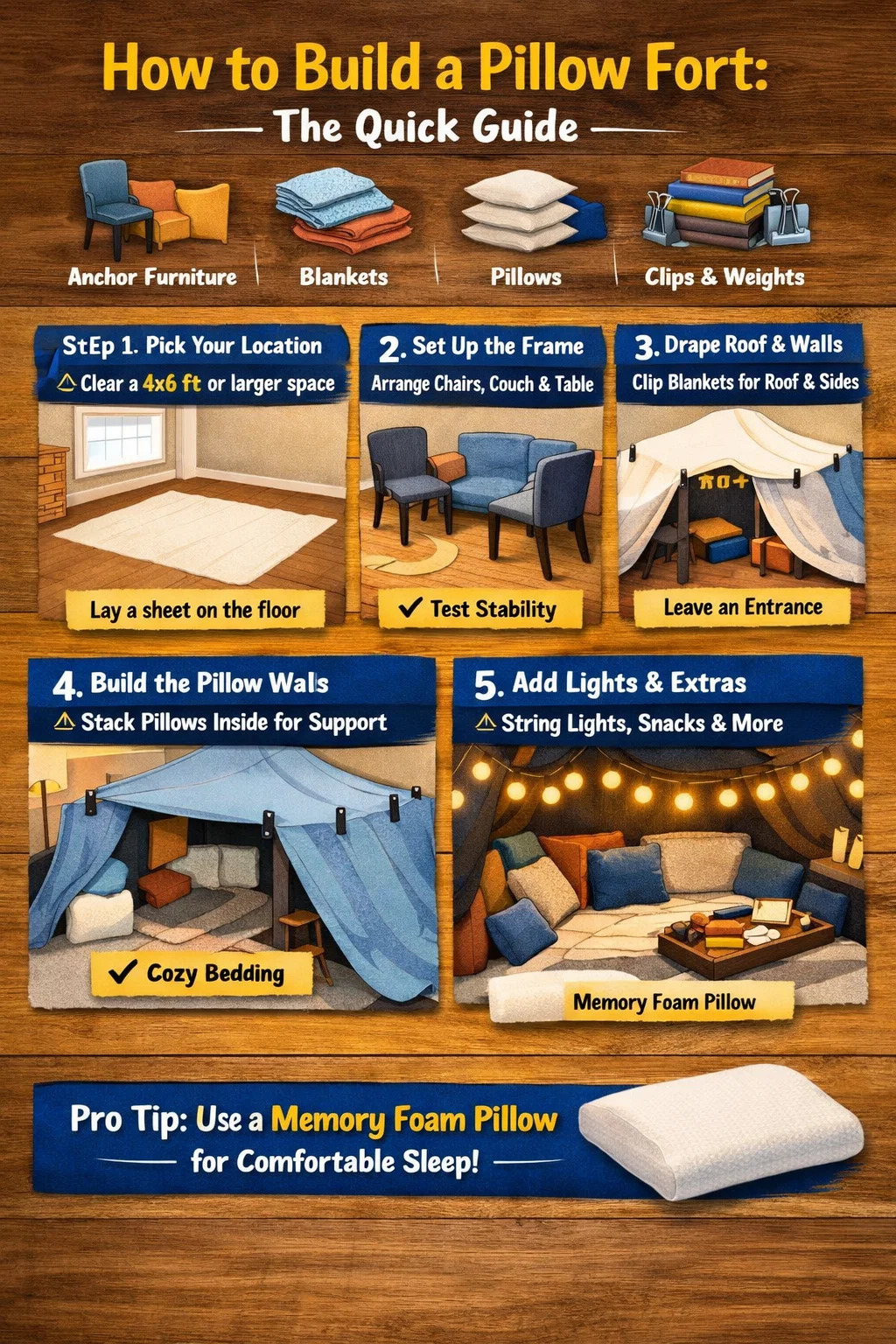 温度に関する注意点: ピローフォートは体の熱を効果的に閉じ込めます。標準的な低反発固体枕は、密閉された空間に 30 ~ 60 分置くと、著しく暖かく感じることがあります。暑くて寝る傾向がある場合、または部屋が 70°F 以上である場合は、 ジェル注入低反発枕 少額の追加費用を支払う価値があります。基本的な固形フォームの場合は 25 ドルから 60 ドルであるのに対し、ほとんどのジェル注入オプションは 40 ドルから 90 ドルの間です。