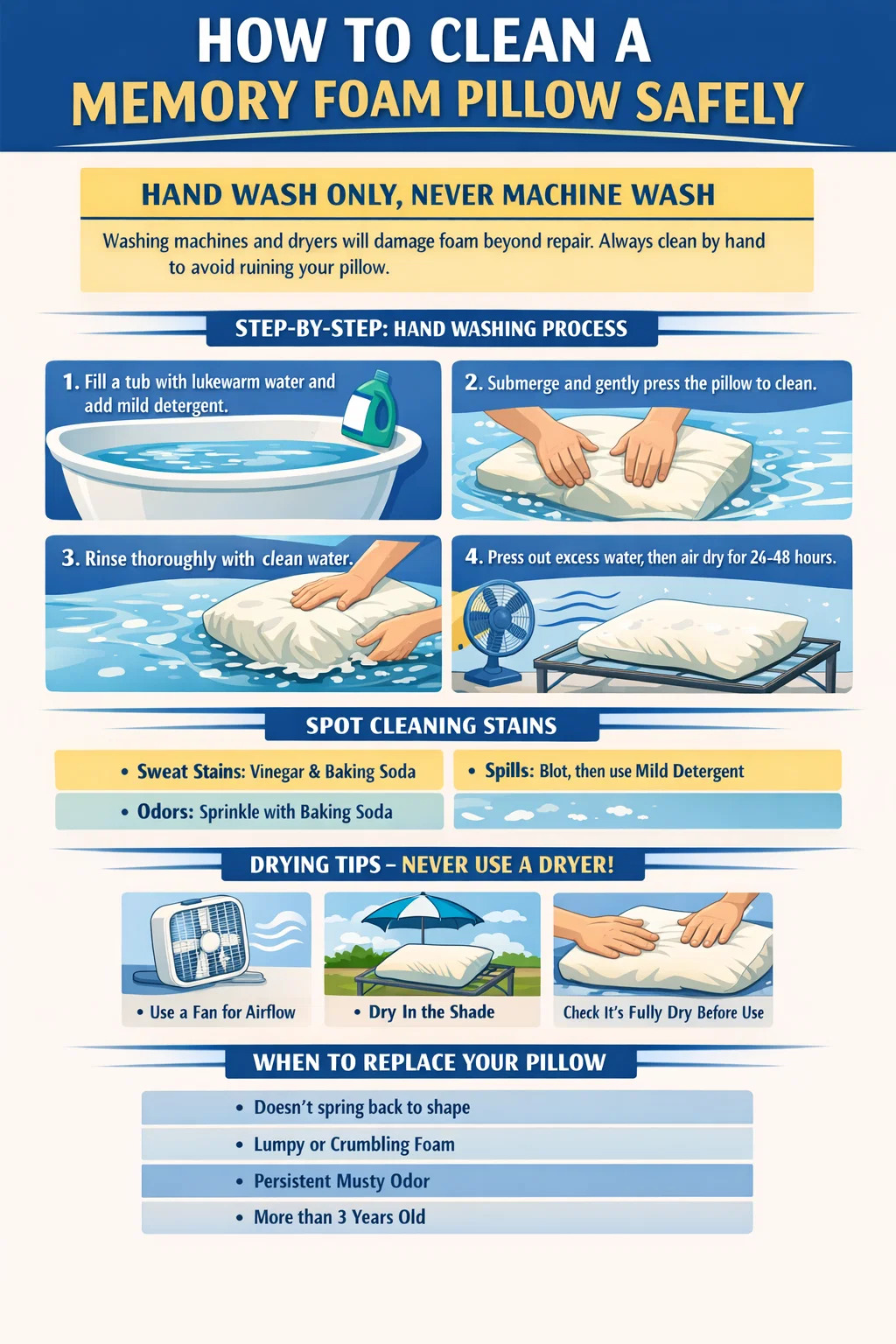 フォームピローの損傷やカビの問題のほとんどは、不適切な乾燥が原因です。これは、ほとんどの人が急いだり、間違って処理したりするステップでもあります。以下では、適切に乾燥させるための最も重要な側面について説明します。