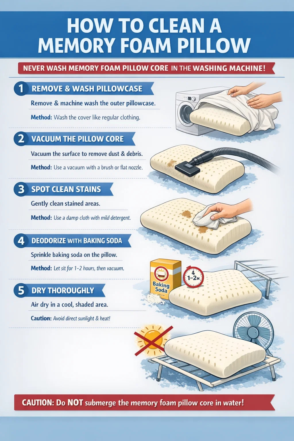 「枕の芯」は洗濯機で洗うことはできませんが、低反発枕は次の手順で安全に洗うことができます。