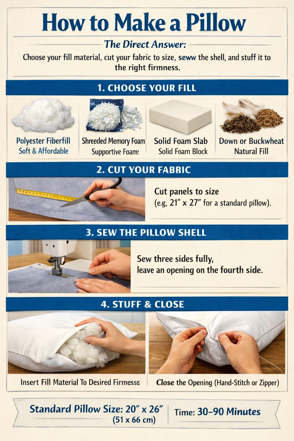 枕の作り方は 4 つの基本から成ります。中材の選択、生地のサイズに合わせた裁断、シェルの縫製、適切な硬さの詰め物です。ほとんどの人にとって、 標準的なベッド枕のサイズは 20 × 26 インチ (51 × 66 cm) 生地の裁断から最後の縫い目を閉じるまでのプロセス全体には、中綿の種類に応じて 30 ~ 90 分かかります。低反発枕を使用する場合、緩い繊維を充填するのではなく、フォームを切断または細断するため、プロセスが若干異なりますが、構造的なアプローチは同じです。