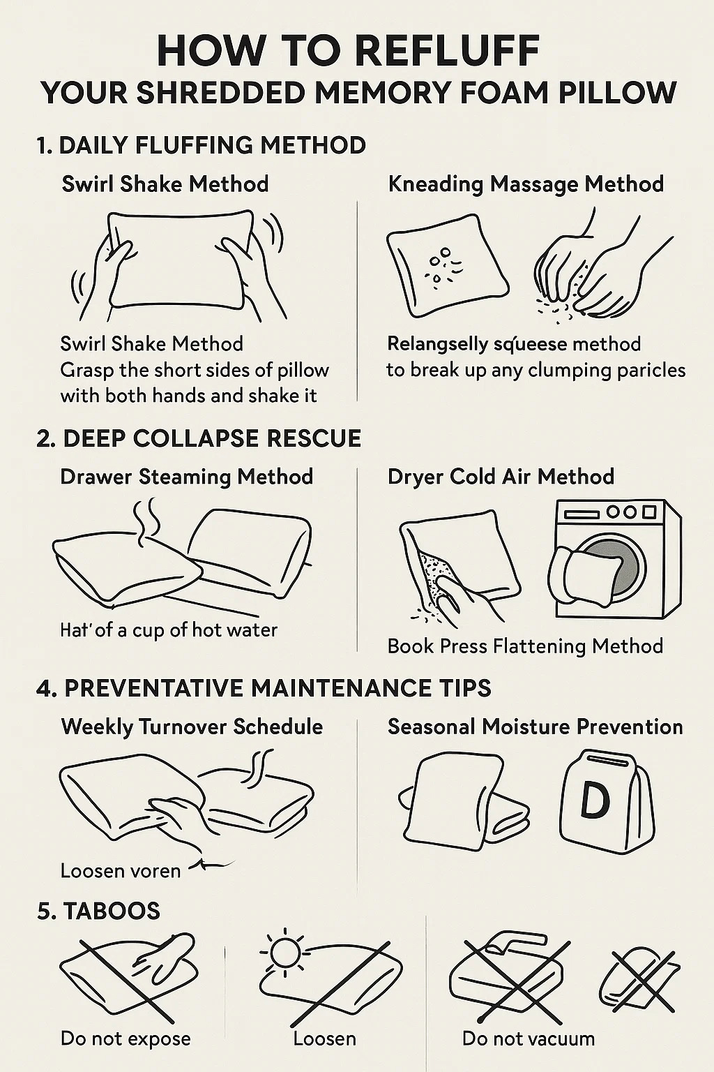 渦巻き方式:枕の短い側面を両手でつかみ、粒子を分配するために毛布のように3回すぐに上下に振ります。