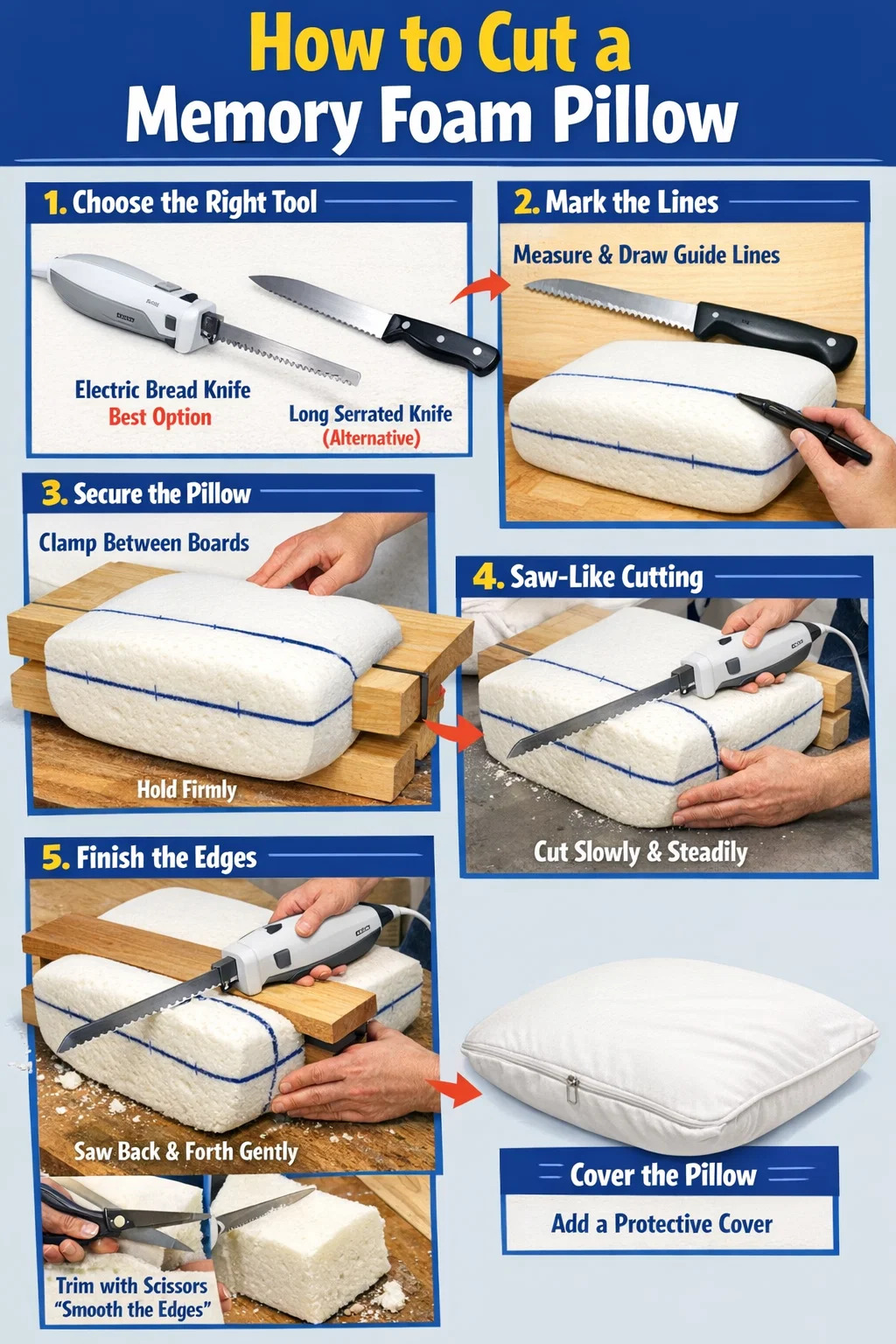 場合によっては、 低反発枕 高すぎる場合、または背もたれや旅行用枕に変換したい場合は、切削工具を使用する必要がある場合があります。メモリーフォームは非常に丈夫で密度の高い素材であるため、無計画に切断すると、端が不均一ででこぼこした状態になってしまう可能性があります。